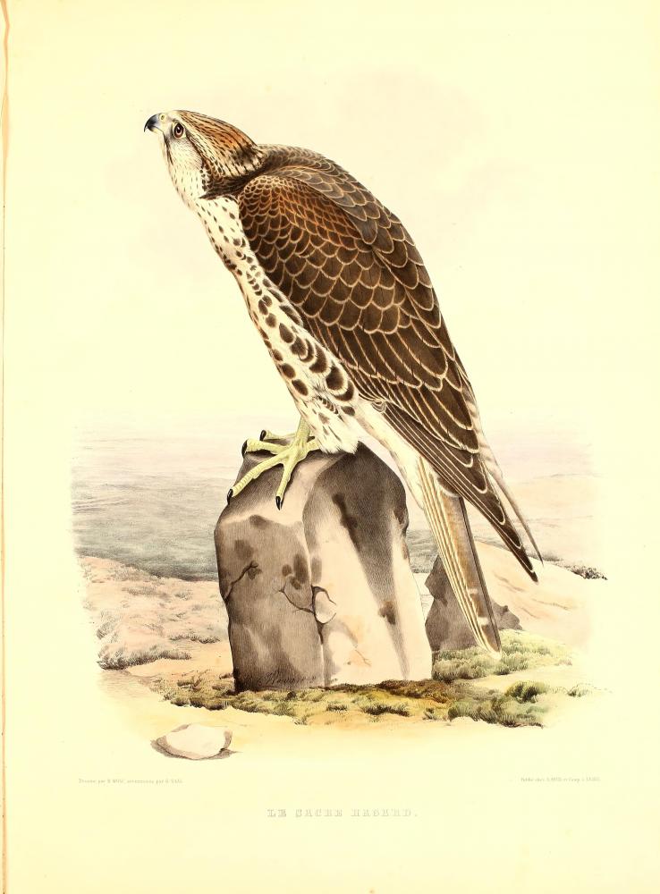 Molt semblant a l’anterior en les seues característiques, però de menor grandària i tonalitats marrons, el (falcó) sacre –denominat igualment halcón sacre en castellà– també era molt preat per les seues qualitats per a la caça. No obstant això, la seua obtenció era molt més senzilla i menys costosa que la del grifalt; els mercaders els portaven en gran nombre, principalment de Càndia (Creta), on es capturaven en el seu pas migratori, encara que ocasionalment alguns exemplars es capturaven a la península Ibèrica. Això no obstant, malgrat el reconeixement de les virtuts que poseïa per a la caça, tant el sacre com el grifalt eren considerats “falcons villans”, a causa, entre altres raons, del caràcter més esquerp que convertia el seu ensinistrament i el maneig en la caça en accions més complicades i exigents.